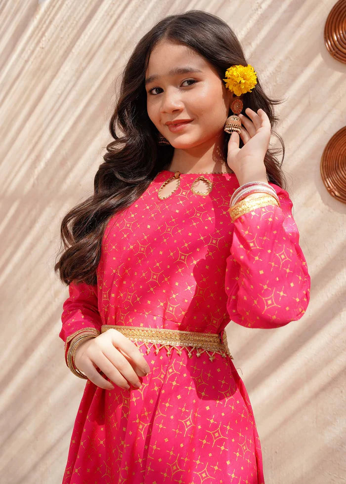 3 Piece Pink Rawsilk Printed Frock
