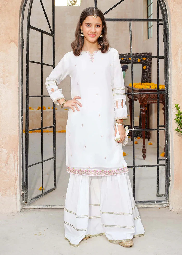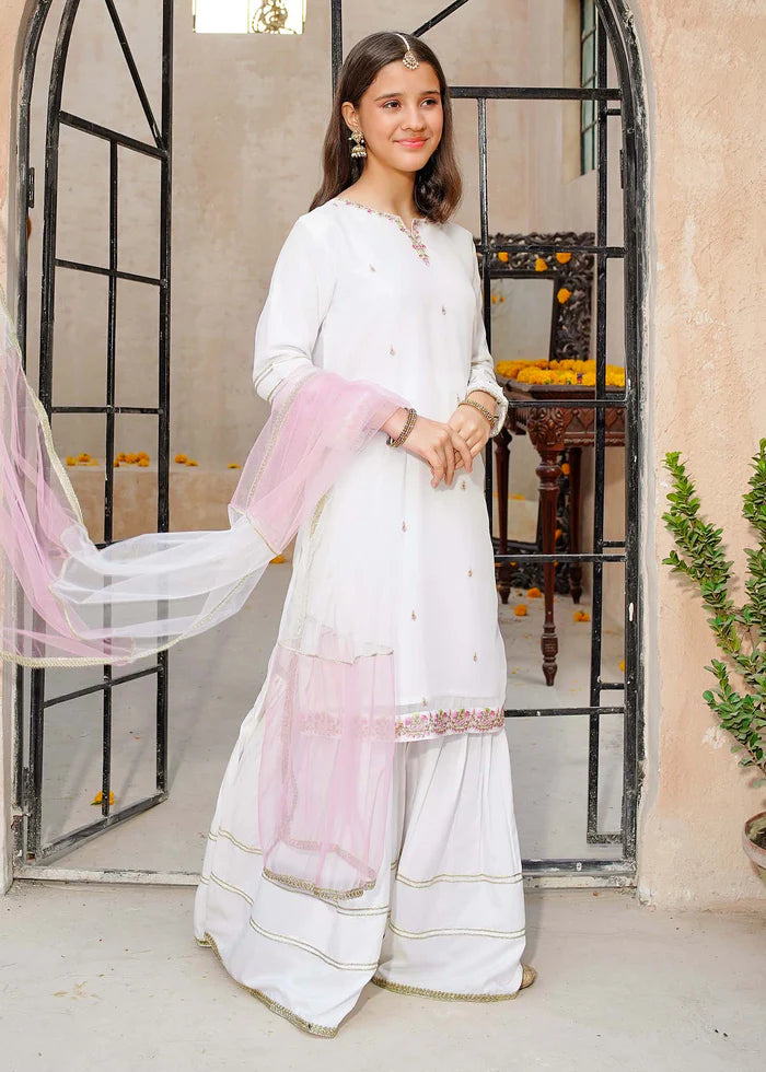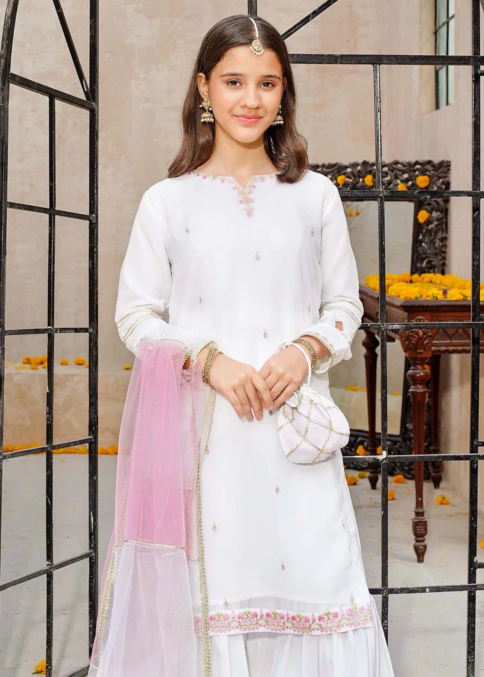 3 Piece White Chiffon Embroidered Gharara